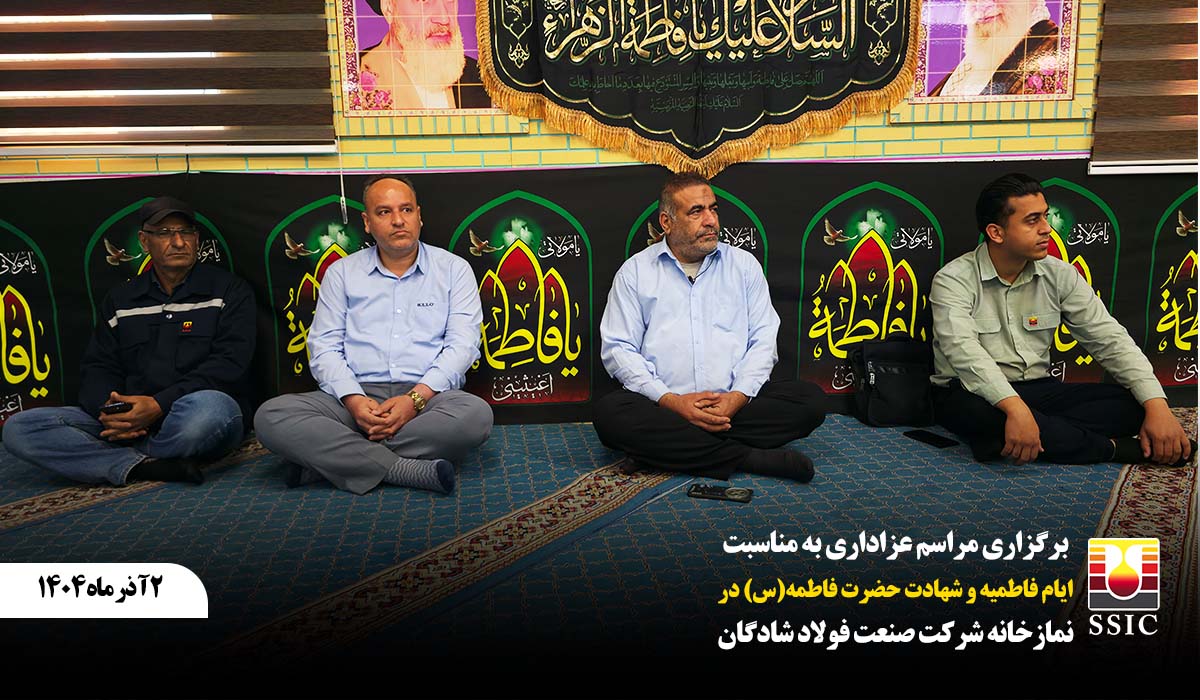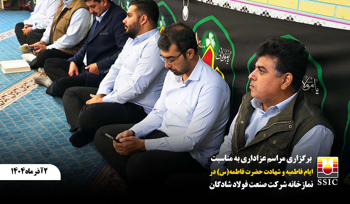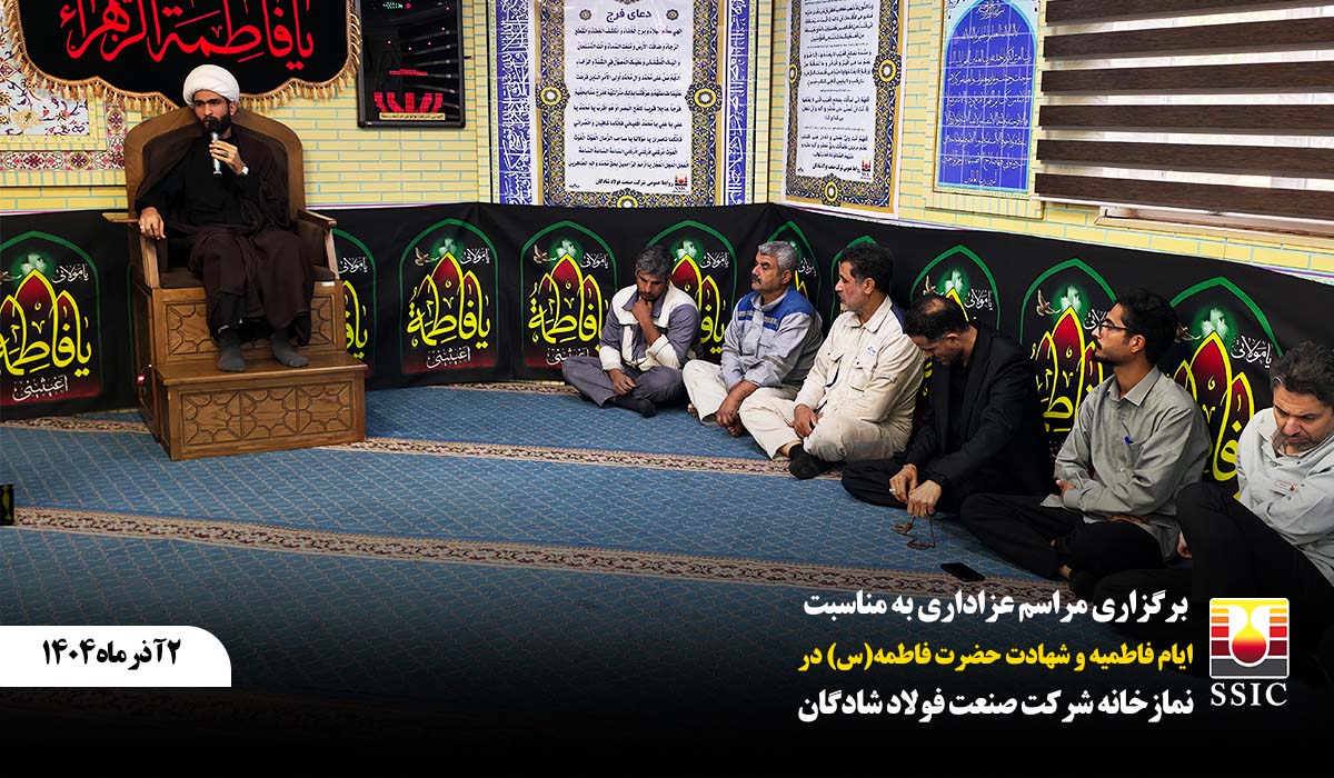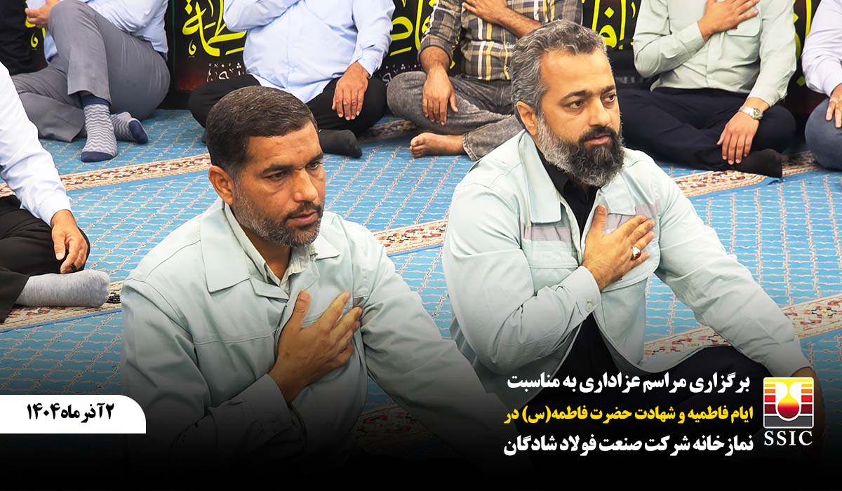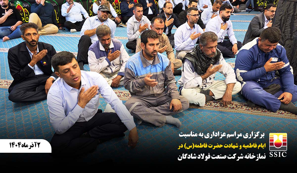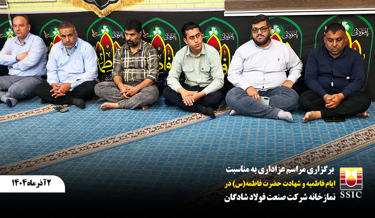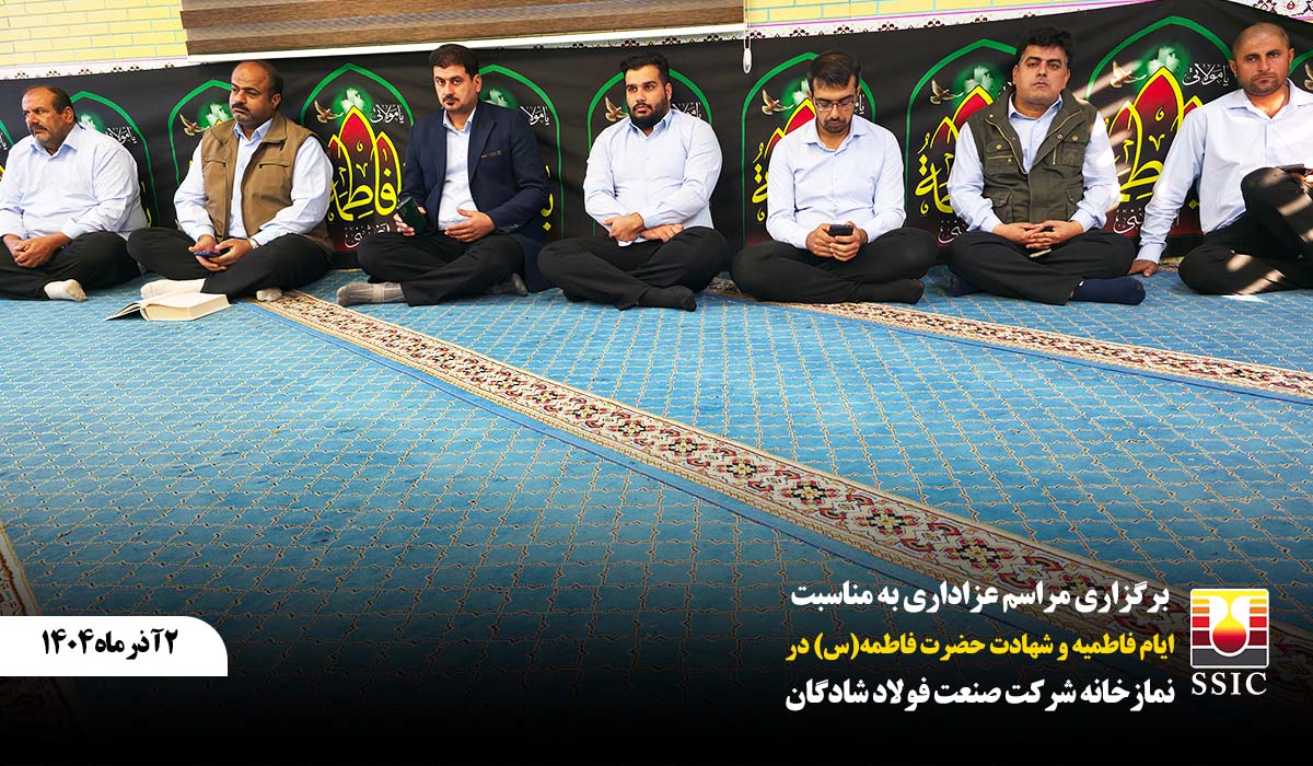 مراسم معنوی عزاداری به مناسبت ایام فاطمیه و سالروز شهادت حضرت فاطمه زهرا‌(س) روز یکشنبه ۲ آذر ۱۴۰۴ از ساعت ۸:۰۰ صبح آغاز و در ساعت ۹:۳۰ به پایان رسید و در نمازخانه شرکت صنعت فولاد شادگان برگزار شد.