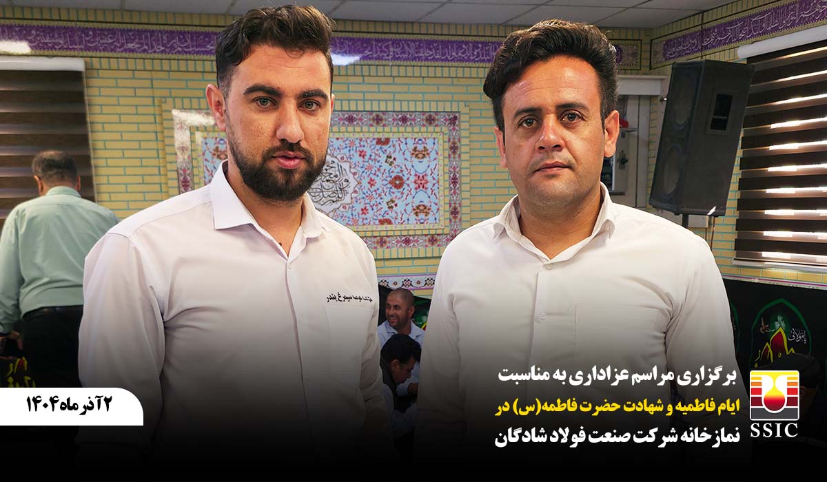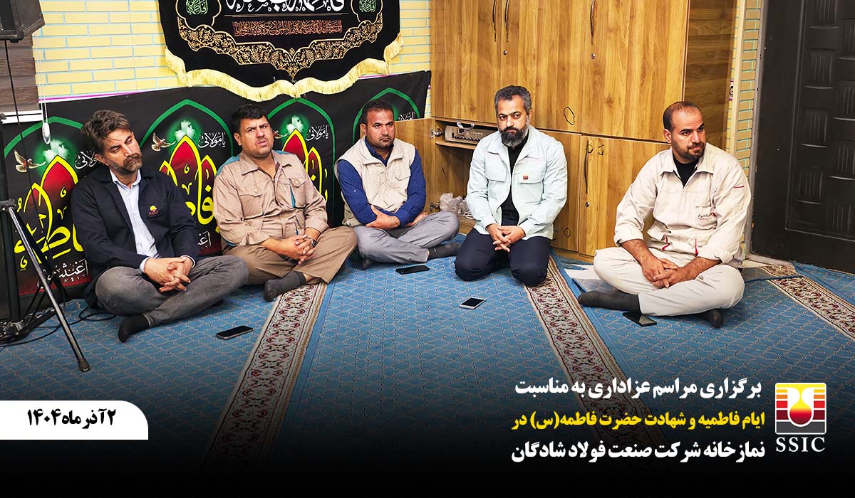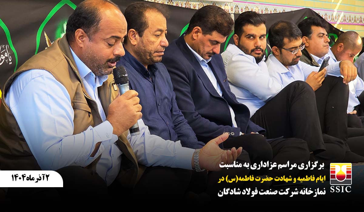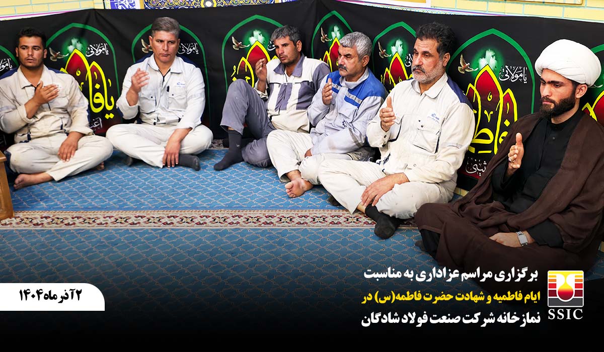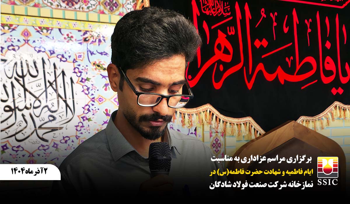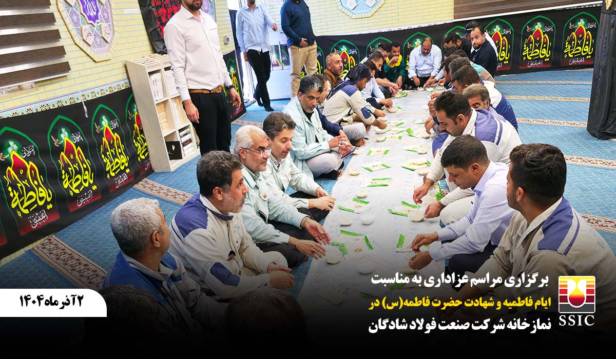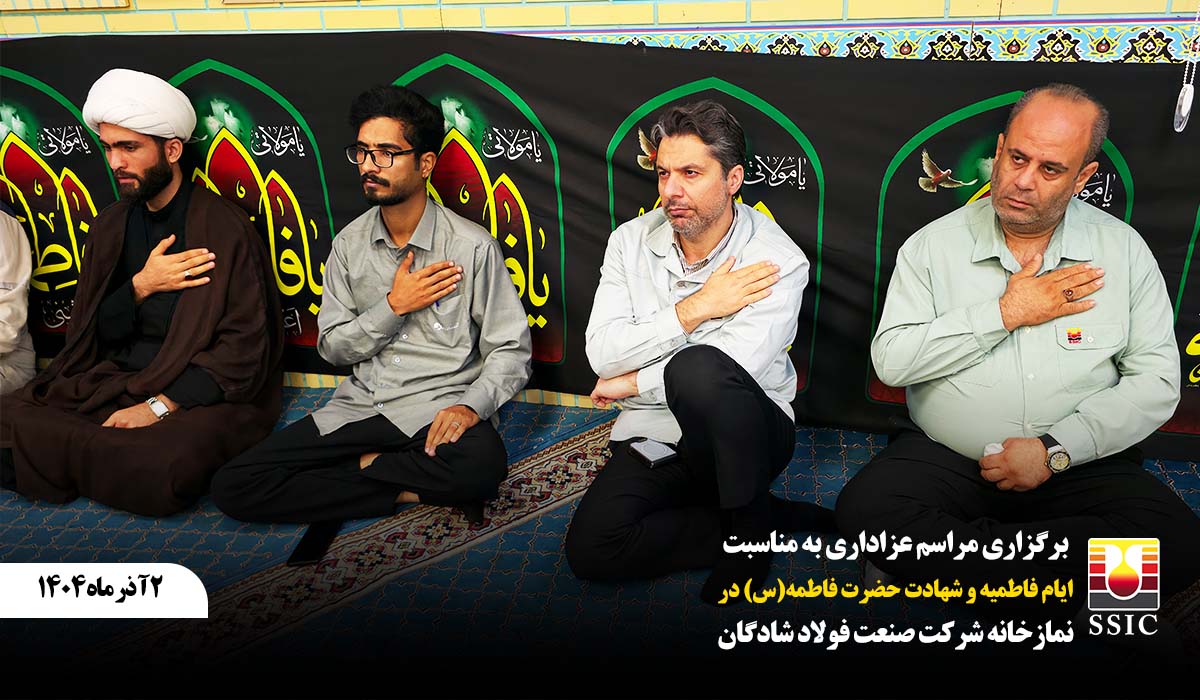 مراسم معنوی عزاداری به مناسبت ایام فاطمیه و سالروز شهادت حضرت فاطمه زهرا‌(س) روز یکشنبه ۲ آذر ۱۴۰۴ از ساعت ۸:۰۰ صبح آغاز و در ساعت ۹:۳۰ به پایان رسید و در نمازخانه شرکت صنعت فولاد شادگان برگزار شد.
